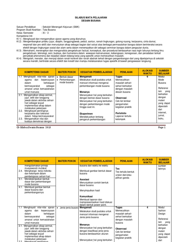 Silabus Desain Busana Kelas Xi / Silabus Desain Busana Kelas Xi Semester 1 Smk Kurikulum 2013 Tahun 2020 Smkcnw - Membuat produk sesuai rancangan desain dengan bahan utama limbah melalui.